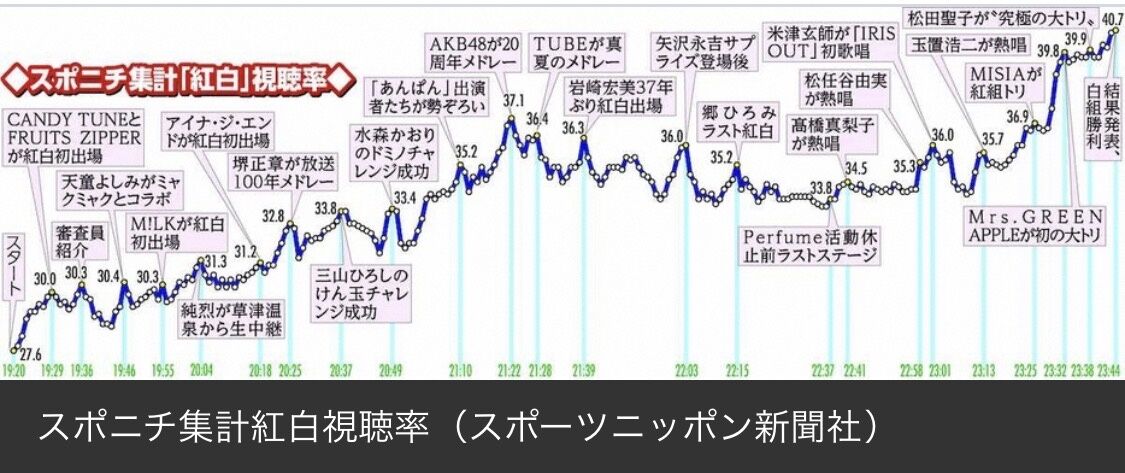 >番組全体では白組の優勝が発表された午後11時44分の40・7%で、5年ぶりに40%台を記録した。