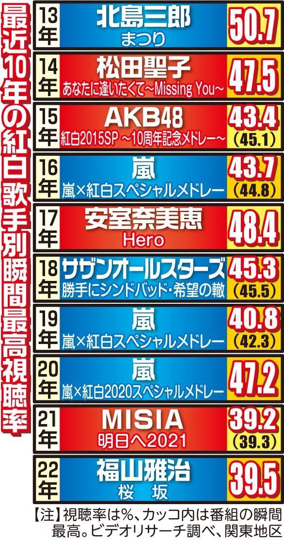 紅白は前回からターゲット層を中高年にシフトさせたことが、功を奏している。2年連続で平均視聴率を上げたことから、この傾向は続くとみられる。番組関係者は「その年のヒット曲を歌えば視聴率が上がる紅白ではなくなってきた。中高年に響く往年のヒット曲をどれだけ届けられるか」と今後の見通しを示した。