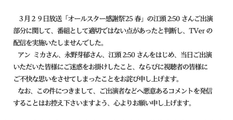 アン ミカさん、永野芽郁さん、江頭2:50さんをはじめ、当日ご出演いただいた皆様にご迷惑をお掛けしたこと、ならびに視聴者の皆様にご不快な思いをさせてしまったことをお詫び申し上げます。